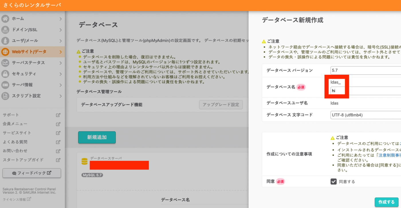 さくらのレンタルサーバの利用を前提します。その他のサーバをお使いの場合は、適宜読み替えてください。 # データベースの作成 さくらのレンタルサーバにおいて、以下のように、新規のデータベースを作成します。