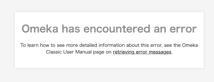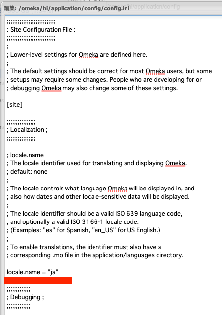 これにより、エラーメッセージが表示されるようになります。 ## (参考)日本語化する 以下に示すように、/home/xxxx/www/omeka/hi/application/config/config.ini の locale.nameにjaを与えます。