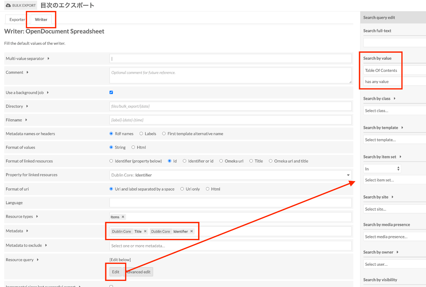 ここでは、「Table Of Contents(dcterms:tableOfContents)」を持つアイテムのみに限定し、「タイトル(dcterms:title)」と「識別子(dcterms:identifier)」のみをエクスポートしてみます。