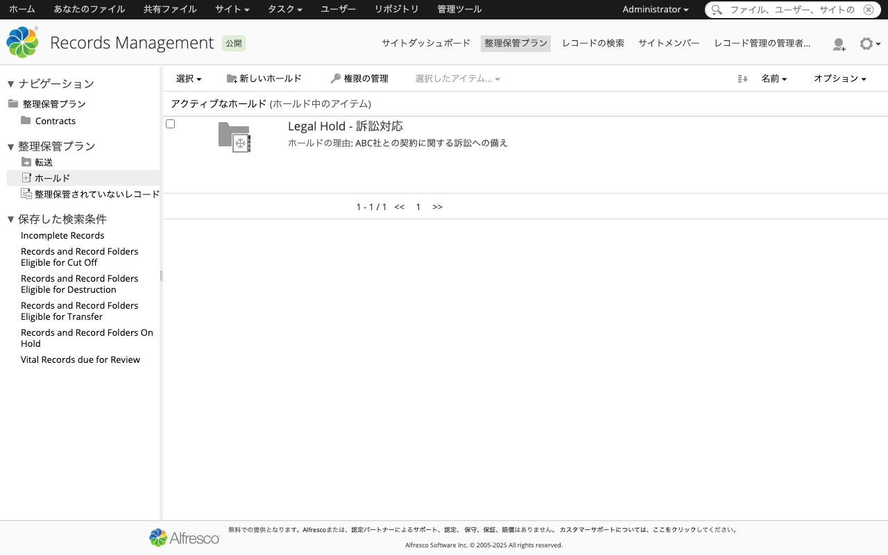 訴訟対応などの理由で、特定のレコードの廃棄を一時停止する必要がある場合、「ホールド」機能を使用します。