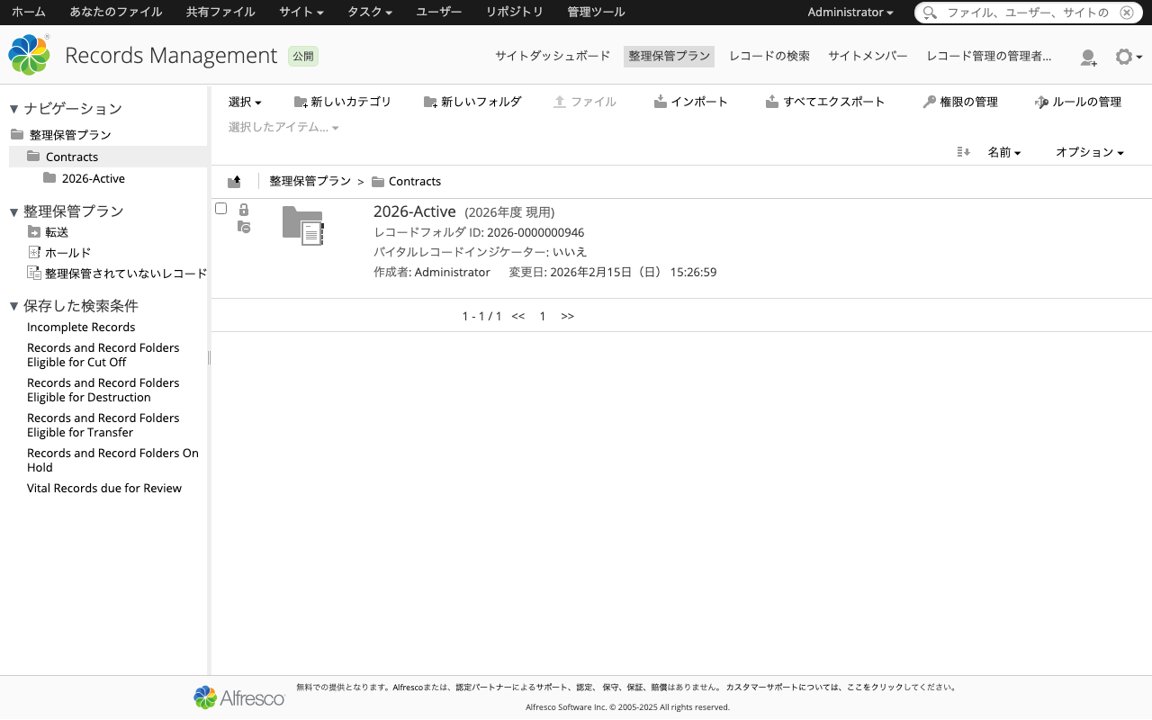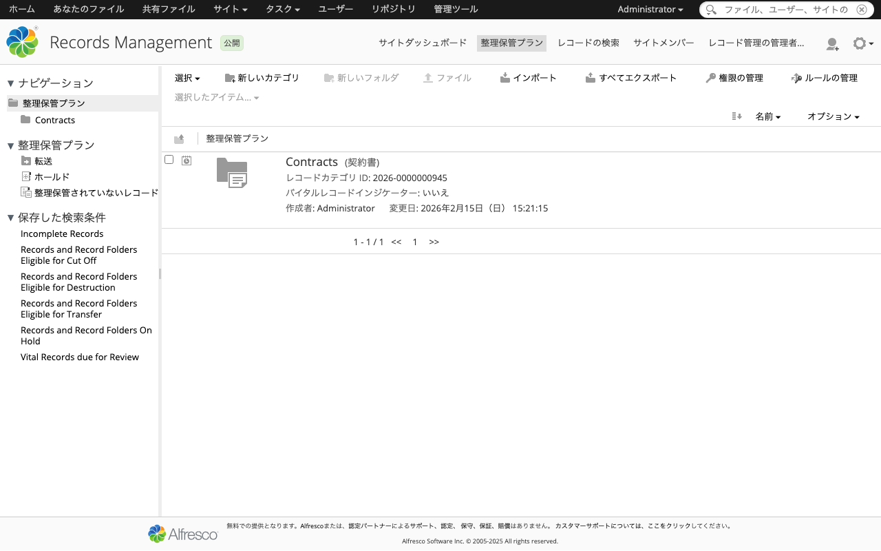 保持スケジュールは、レコードのライフサイクルを定義するものです。カテゴリに対して設定し、その配下のフォルダ・レコードに適用されます。