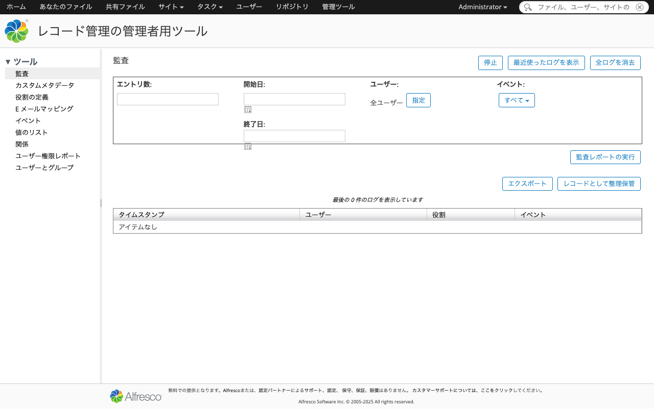 | 監査ログ確認 | GET | /alfresco/s/api/rma/admin/rmauditlog |