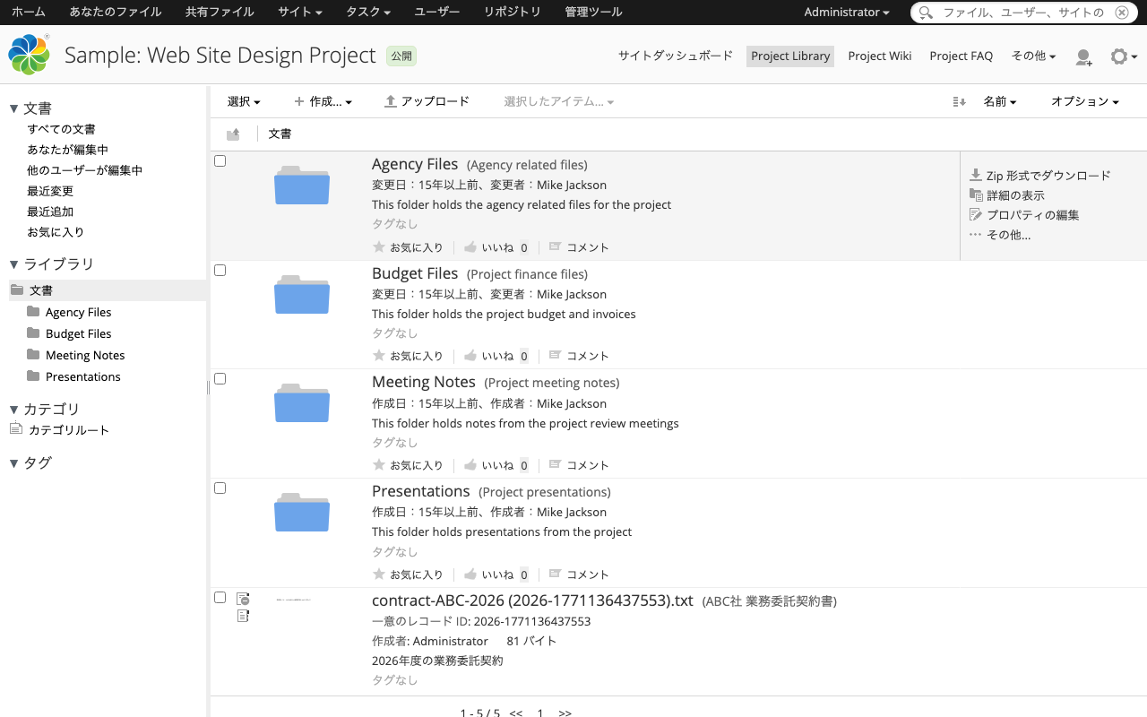 サンプルサイトのドキュメントライブラリにアップロードされたファイルは、以下のように表示されます。