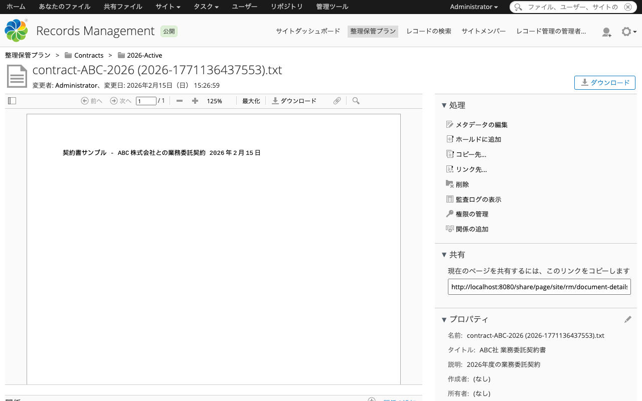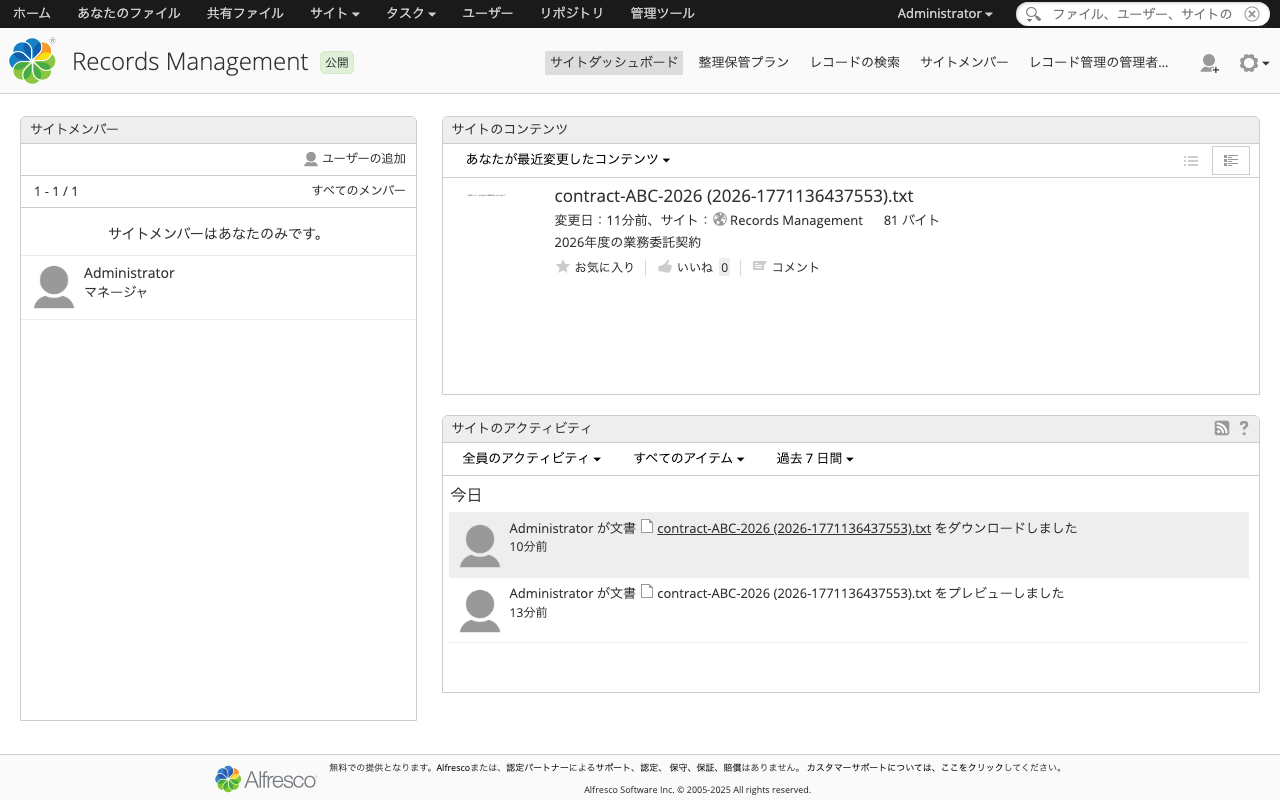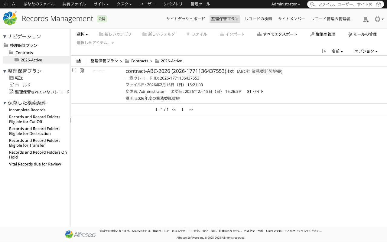 本記事では、Alfresco Governance Services Community Edition 25.3.0を使って、レコード管理の一連のライフサイクルをREST APIで体験しました。