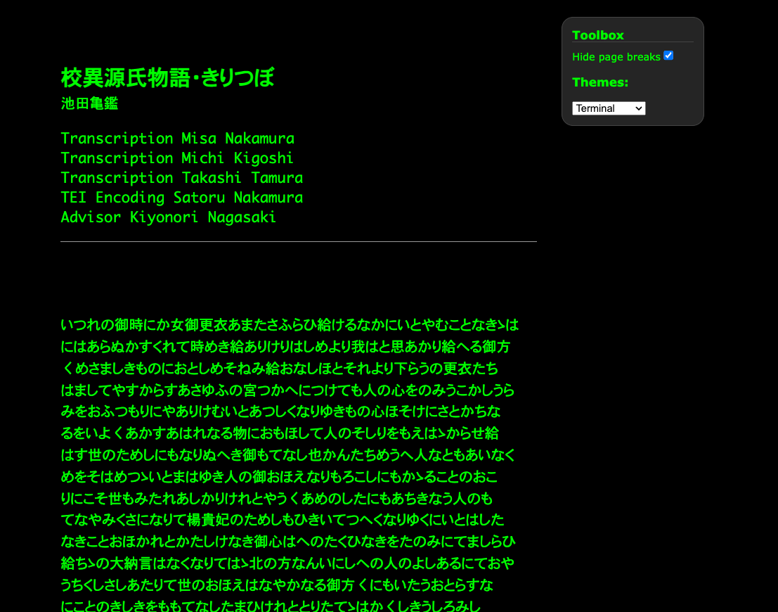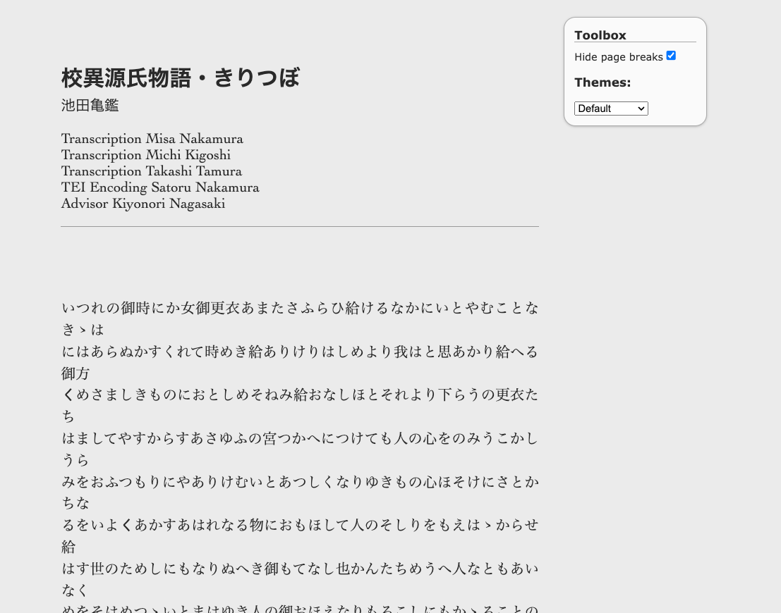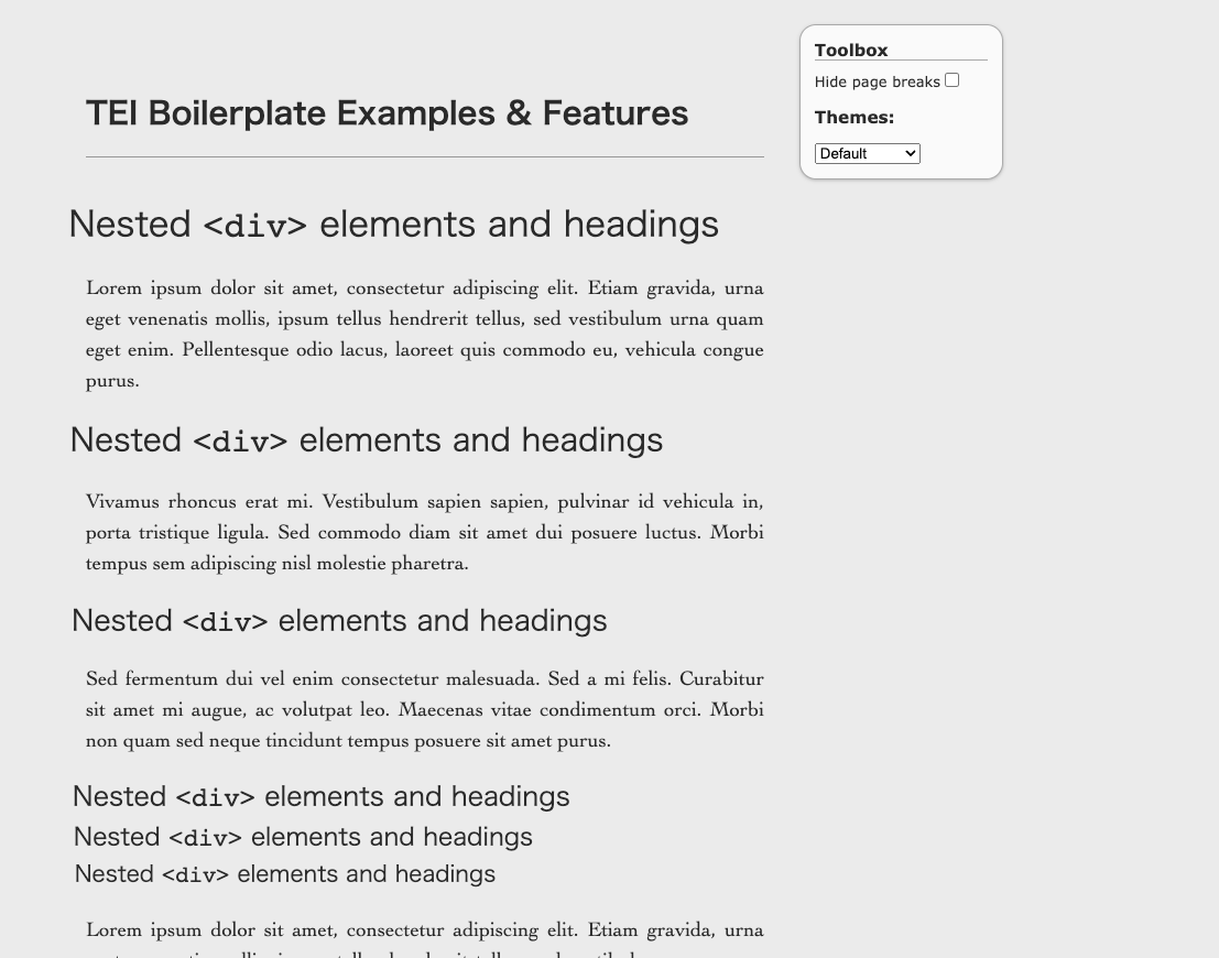 TEI ( Text Encoding Initiative ) P5 コンテンツを最新のブラウザーで直接公開するための軽量ソリューションです。TEI Boilerplate を使用すると、サーバー側での処理や HTML への変換を行わずに、TEI XML ファイルを Web に直接提供できます。当社のTEI Boilerplate Demoは、TEI Boilerplate によってレンダリングされる多くの TEI 機能を示しています。