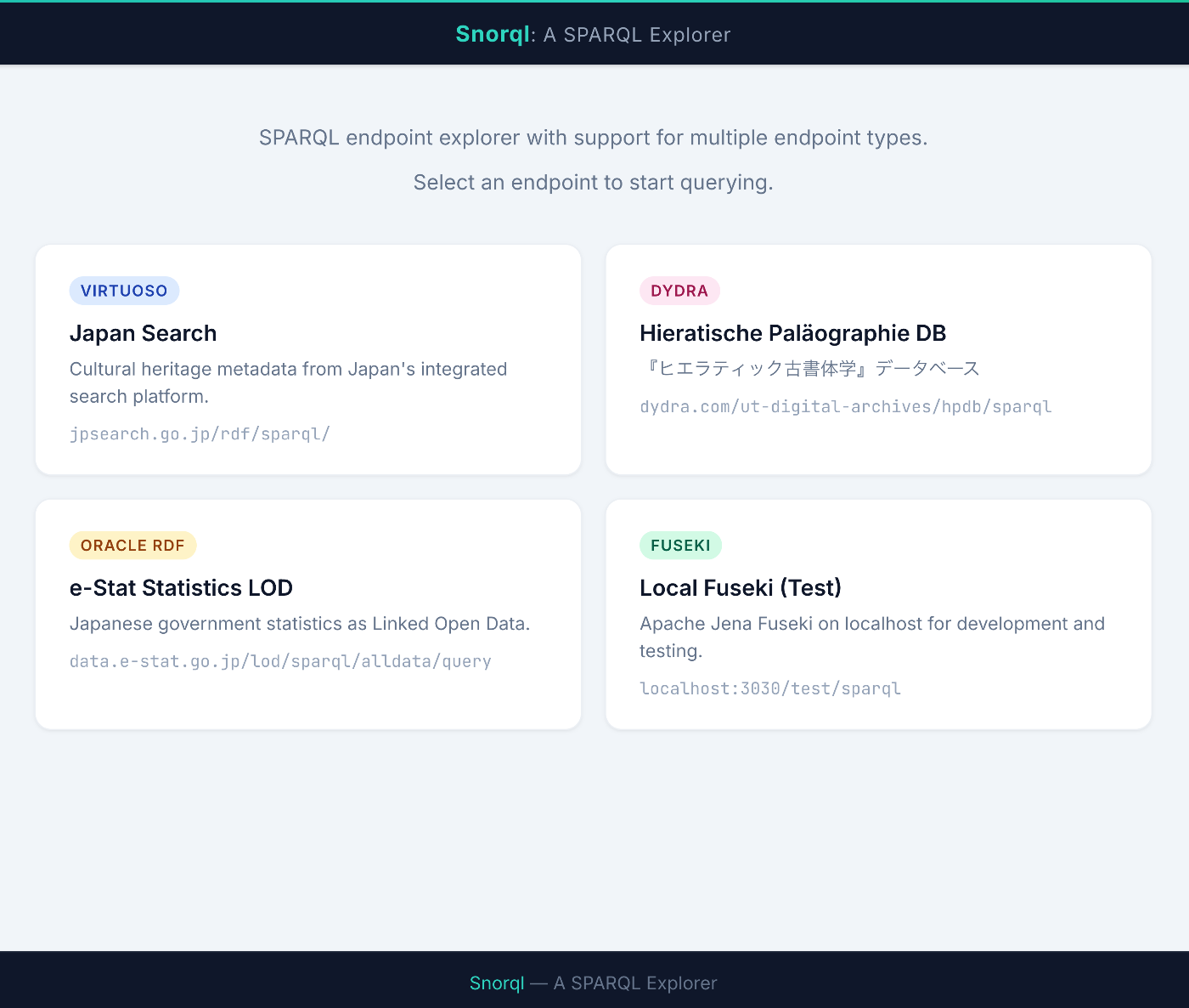 Snorql はもともと kurtjx/SNORQL として公開されていた SPARQL Explorer を、@masaka 氏が Japan Search 向けに大幅に拡張したものです。本リポジトリでは、そのコードベースをさらに再構成し、複数のエンドポイントに対応するマルチテナント構成 としています。
