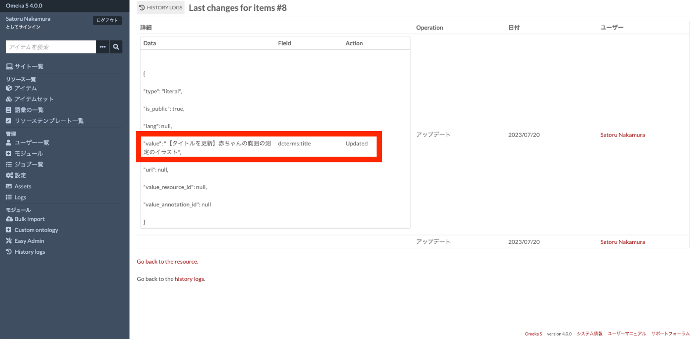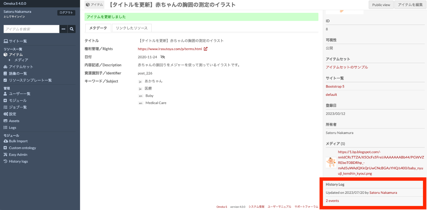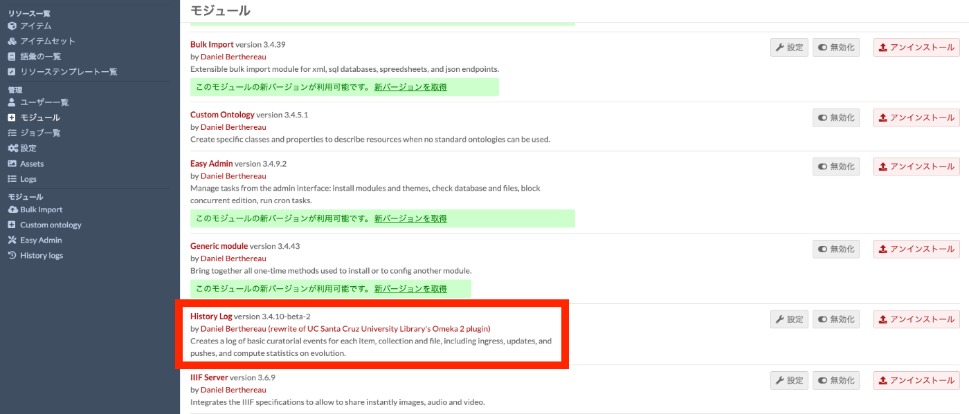 2023/07/20時点において、まだベータ版のようですが、Omeka Sで変更履歴を記録するモジュール「Omeka-S-module-HistoryLog」を試す機会がありましたので、備忘録です。