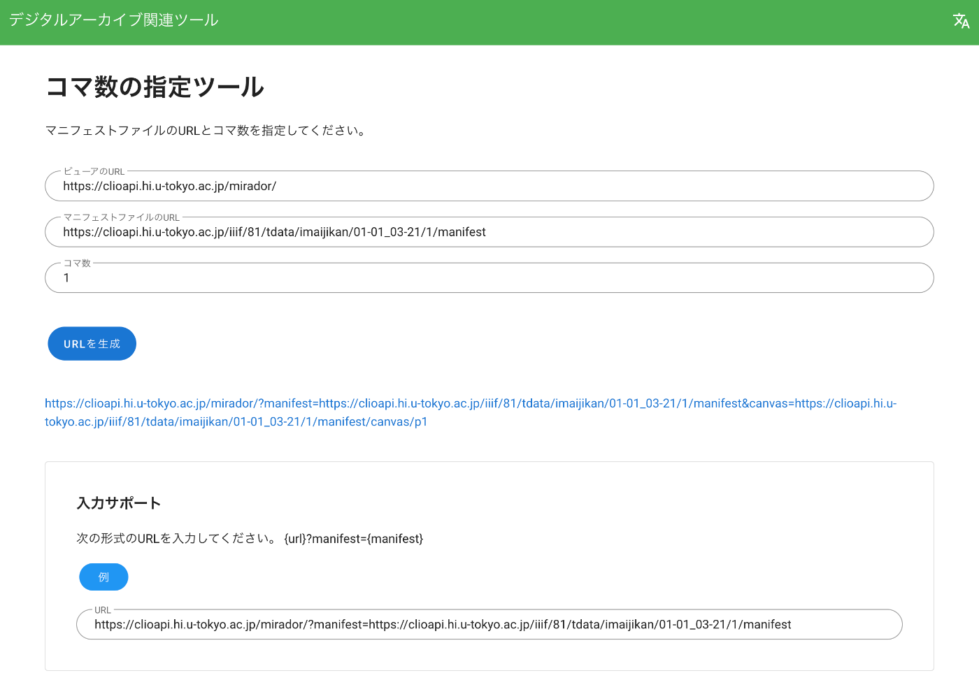 コマ数を指定して「URLを生成」を押すと、カンバスIDが指定されたURLが表示されます。