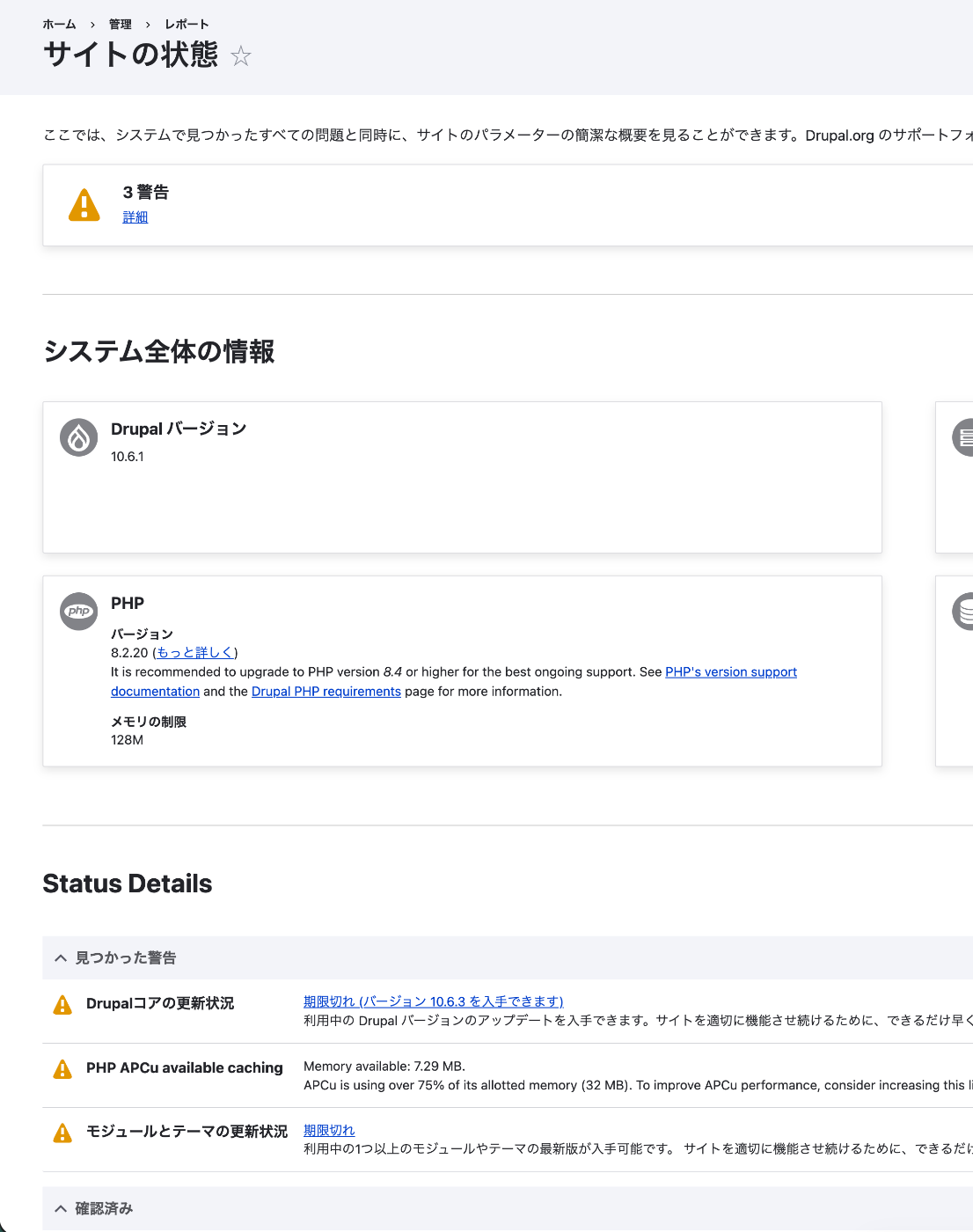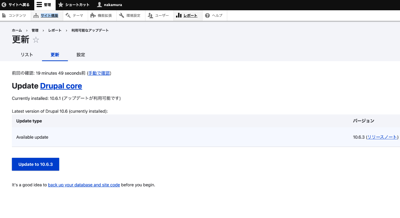 - Drupal コアの更新状況:期限切れ(バージョン 10.6.3 が入手可能)