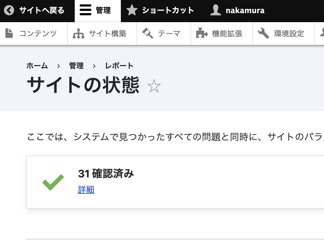 すべての更新が完了したら、「レポート > サイトの状態」を確認する。警告が解消され、「31 確認済み」と表示されていれば成功。