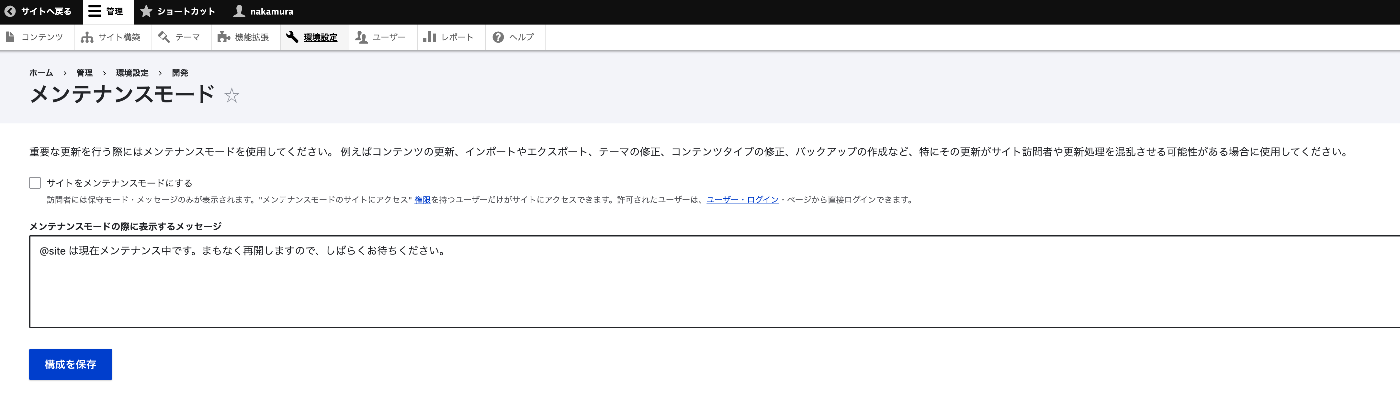 更新はメンテナンスモードで実行されるため、完了後は「オンラインにする」リンクからメンテナンスモードを解除する。「管理 > 環境設定 > 開発 > メンテナンスモード」画面で「サイトをメンテナンスモードにする」のチェックを外し、「構成を保存」を押す。