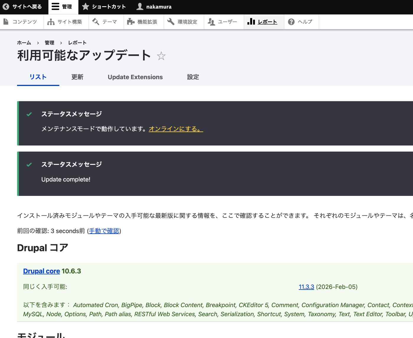 完了すると「Update complete!」のステータスメッセージが表示される。Drupal core が 10.6.3 に更新された。