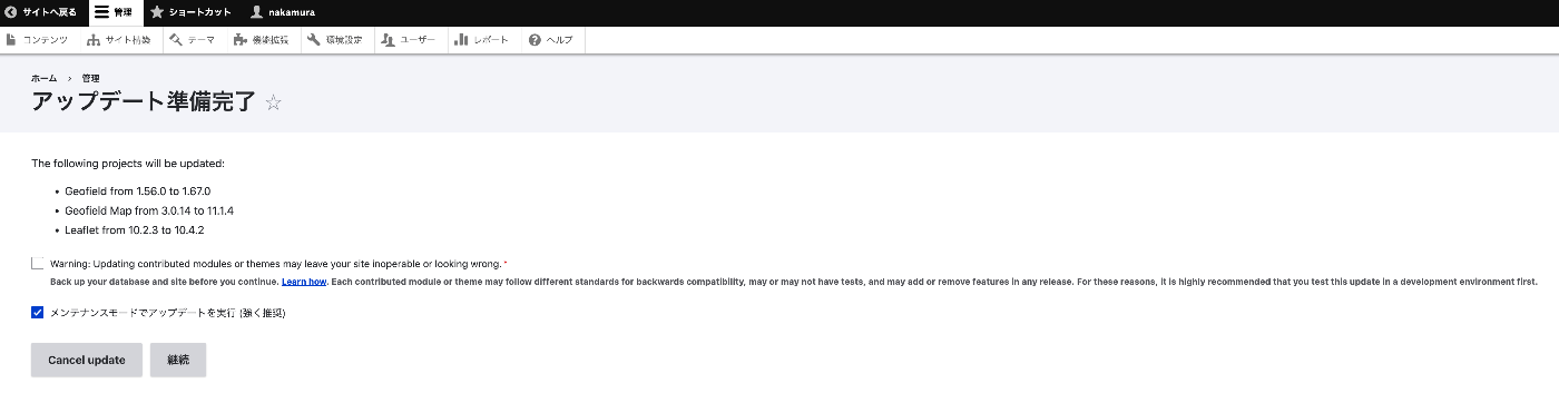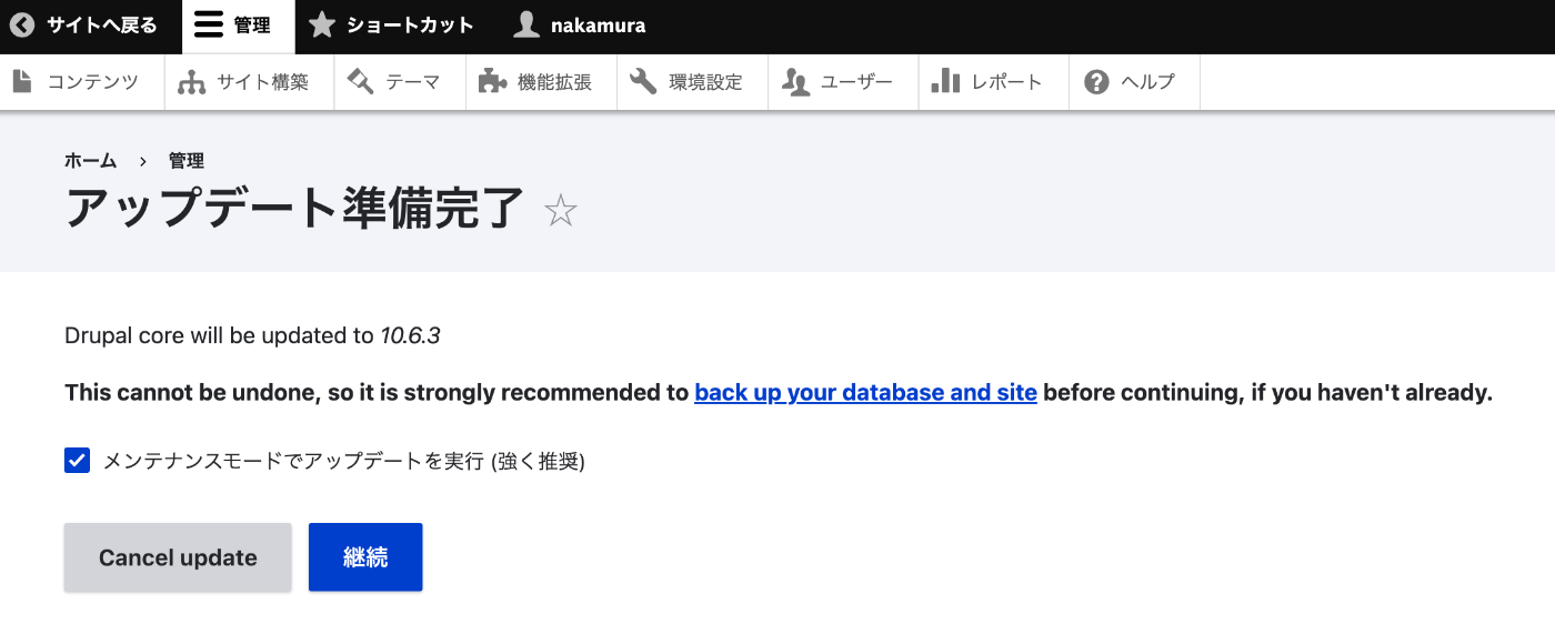 ダウンロード完了後、「アップデート準備完了」画面に遷移する。「Drupal core will be updated to 10.6.3」と表示されるので、「メンテナンスモードでアップデートを実行」にチェックが入っていることを確認し、「継続」ボタンを押す。