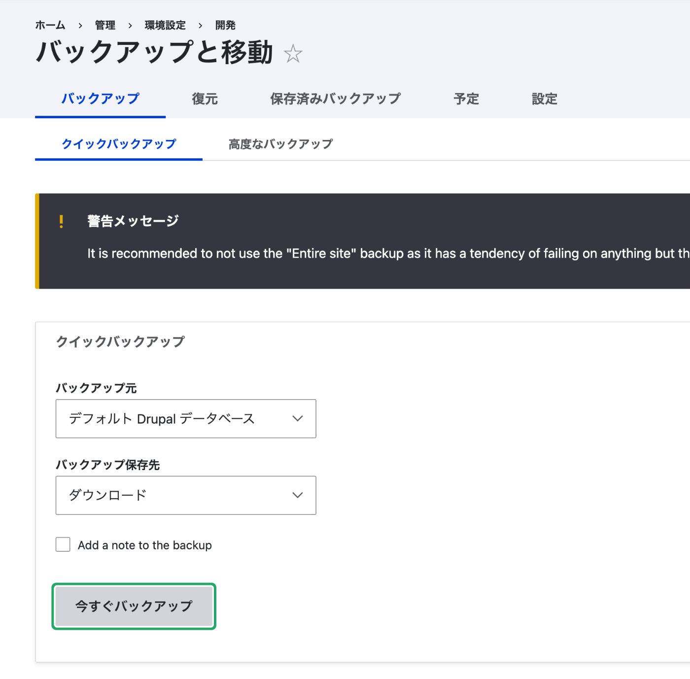 インストール後、「管理 > 環境設定 > 開発 > バックアップと移動」からクイックバックアップが実行できるようになる。バックアップ元に「デフォルト Drupal データベース」、バックアップ保存先に「ダウンロード」を選択して「今すぐバックアップ」を押すと、データベースのバックアップファイルがダウンロードされる。