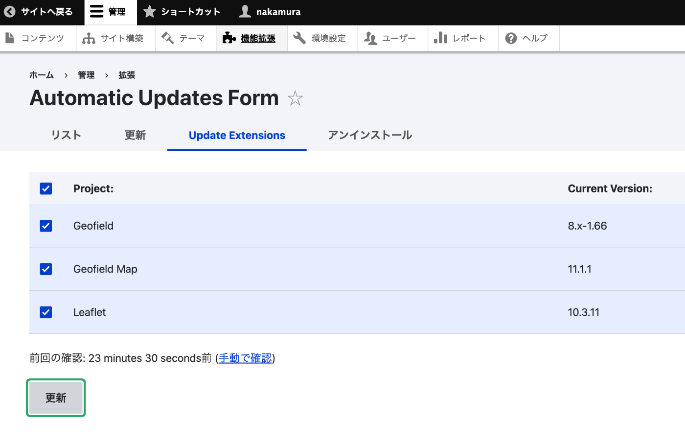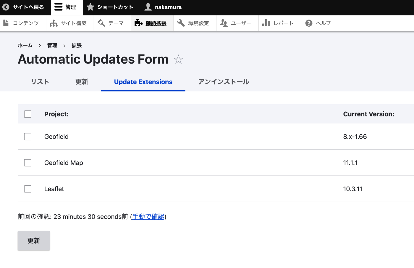 コアの更新が完了したら、「管理 > 拡張 > Update Extensions」タブを開く。更新可能なモジュールが一覧で表示される。