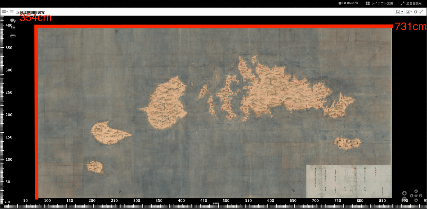 結果、例えば東京大学史料編纂所所蔵の大型絵図である正保琉球国絵図写(請求記号:S島津 76-2-4、法量:354.1×731.0cm)を対象にした場合、以下のように定規を表示させることができます。