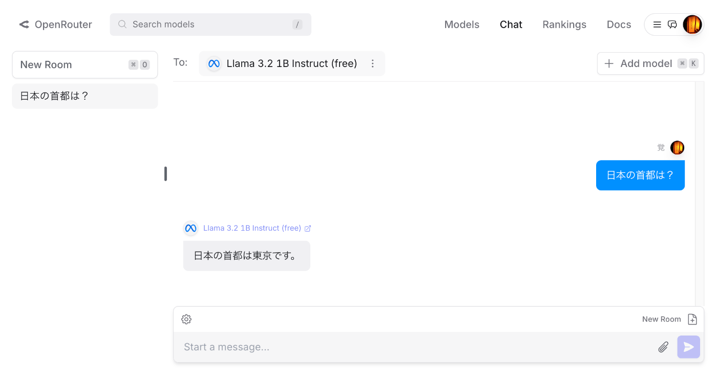 以下は、モデルMeta: Llama 3.2 1B Instruct (free)を使用した例です。