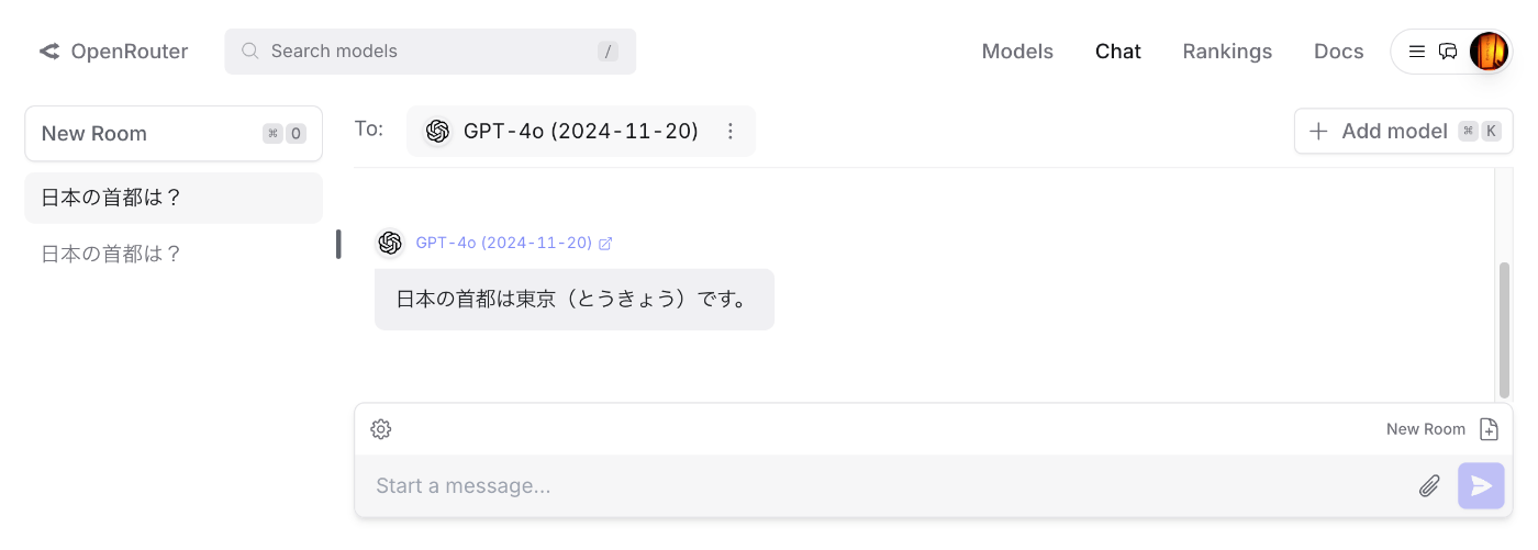 以下は、モデルOpenAI: GPT-4o (2024-11-20)を使用した例です。modelのみを変更することで、共通のスクリプトを利用することができました。